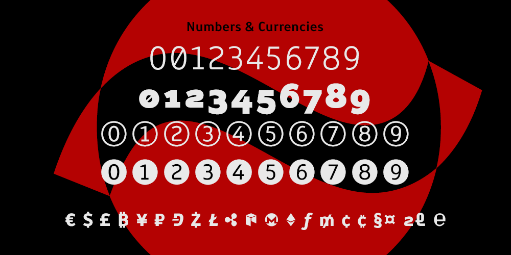 Funciones OpenType: Additional languages, All Alternates, Alternate Annotation Forms, Bitcoin, Capital Spacing, Contextual Alternates, Denominators, Discretionary Ligatures, Fractions, Historical Forms, Inferiors, Kerning, Localized Forms, Numerators, Oldstyle Figures, Optical Size, Ordinals, Scientific Inferiors, Slashed Zero, Standard Ligatures, Stylistic Set, Subscript, Superior letters, Superiors, Superscript.