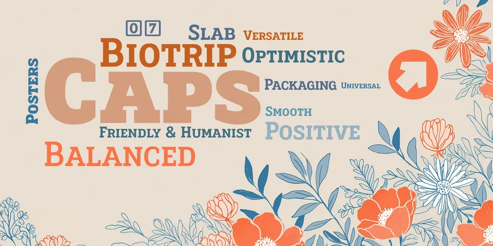Diseño editorial, folletos, pósters, cartelería, logotipos, embalaje de productos, señalización, imagen corporativa. Biotrip Serif Caps está pensada para moverse con soltura entre todos esos mundos. Es una tipografía multipropósito en el sentido más profundo del término: no porque haga concesiones, sino porque está construida con tal refinamiento que funciona en cualquier escenario sin sacrificar su carácter. Biotrip Serif Caps es la herramienta definitiva para cuando necesitas que tu diseño se sostenga por sí mismo, sin apoyos.