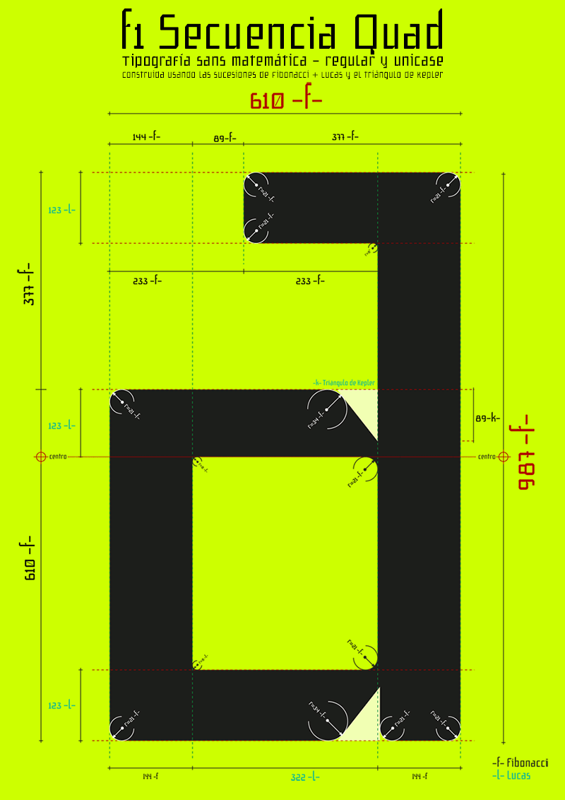 A mediados del año 2012 comencé con un proyecto tipográfico al que he llamado Secuencia, la base de esta idea es la construcción geométrica de letras siguiendo una relación de proporciones basada en la Sucesión de Fibonacci y la de Lucas, también uso algún número de Perrin o números de Tribonacci, pero son las menos, aunque todas estas sucesiones comparten la misma propiedad, al dividir un número de la sucesión por su inmediato anterior nos da un número que se acerca al número áureo.