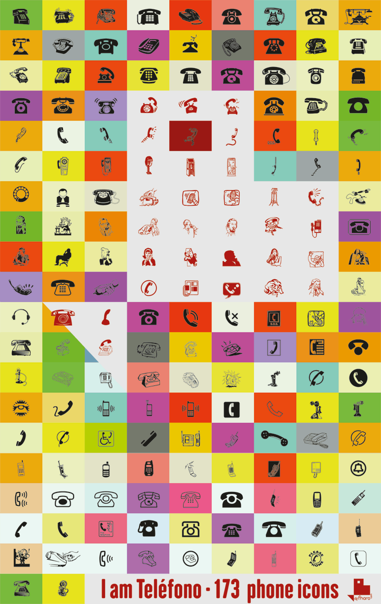 Por fin, los he ordenado por formas, estilos y tipos, encontraréis en esta fantástica colección de signos, iconos y símbolos: teléfonos retro y vintage, teléfonos divertidos, formales, geométricos, en movimiento… también ilustraciones de personas y personajes con teléfonos en la mano, espero que encuentres el estilo gráfico adecuado para cada ocasión creativa.